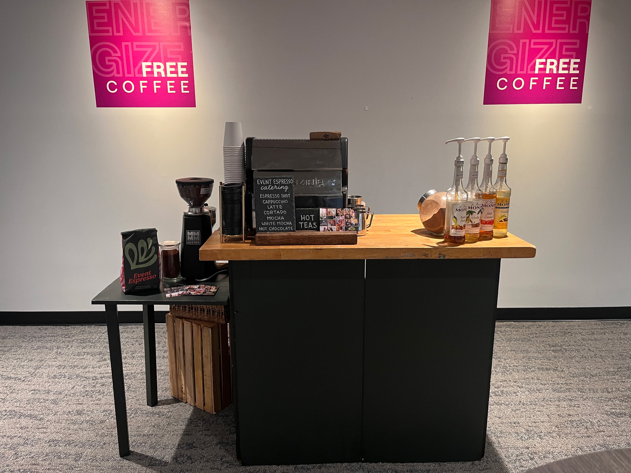 On the day of your event, our Brand Ambassador’s car is packed with coffee gear. This includes a commercial-grade espresso machine, all the tools needed to dial in and pull high-quality shots, syrups, mochas, a bar with a top, a trashcan, and a cooler filled with milk. Everything arrives with us, every time.